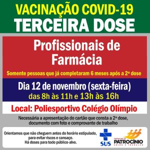 A vacinação da terceira dose dos profissionais de farmácia ocorrerá no Poliesportivo do Colégio Municipal Professor Olímpio dos Santos. O horário que o imunizante será aplicado é das 8h às 11h e das 13h às 16h.
