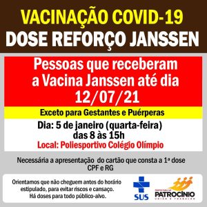 Nesta quarta-feira (05) pessoas que receberam a vacina Janssen até o dia 12 de julho receberão a dose de reforço, com exceção de gestantes e puérperas.