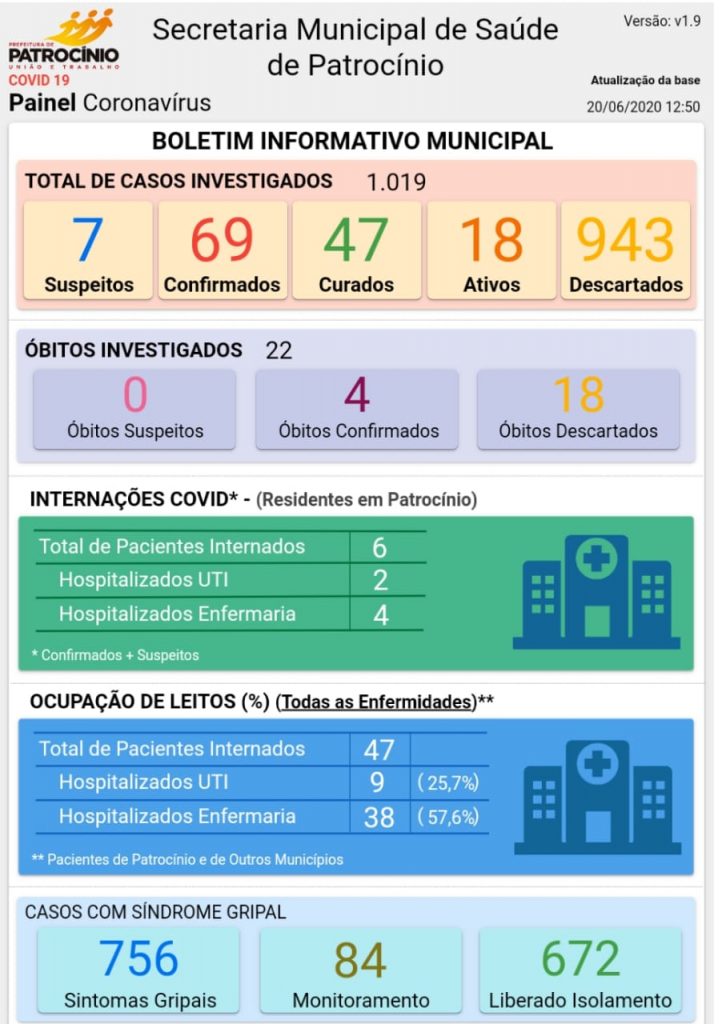 A Secretaria de Saúde de Patrocínio divulgou neste último sábado a atualização do boletim epidemiológico de coronavírus no município.