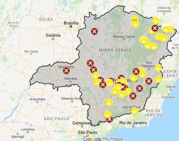 – BR 040, km 562-563, Nova Lima, interdição total. Risco de novo transbordamento da barragem. Pista ainda não foi completamente limpa. Estão autorizados a passar somente veículos de emergência. Sem previsão de liberação.