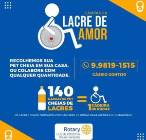 O Rotary Club de Patrocínio Nova Gerações está realizando a campanha Lacre de Amor, com o objetivo de arrecadar lacres metálicos de latinhas de bebidas onde os mesmos serão vendidos e toda renda será revertida para compra de cadeiras de rodas e banho que serão disponibilizadas para empréstimo à comunidade.