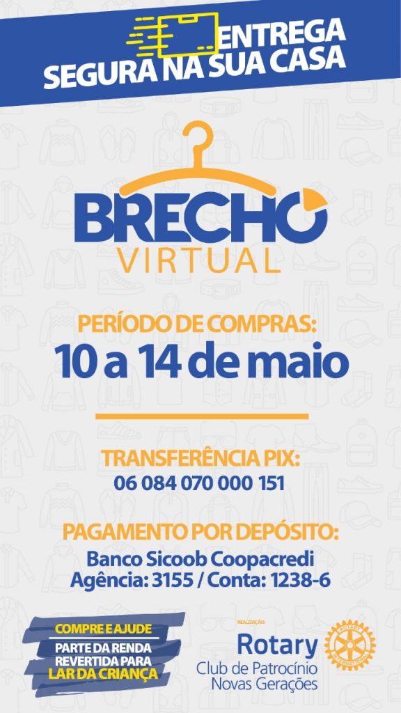 O Rotary Club de Patrocínio Novas Gerações realizará entre os dias 10 a 14 de maio mais uma edição do seu brechó virtual, com parte da renda destinada ao Lar da Criança.