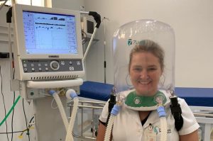 “Esse capacete envolve a cabeça inteira do paciente e é selado com um colar macio e hermético que envolve o pescoço do paciente. O paciente fica super confortável, ele pode dormir, ele mexe o pescoço, ele conversa, ele fica muito confortável ali dentro”, explicou a fisioterapeuta.