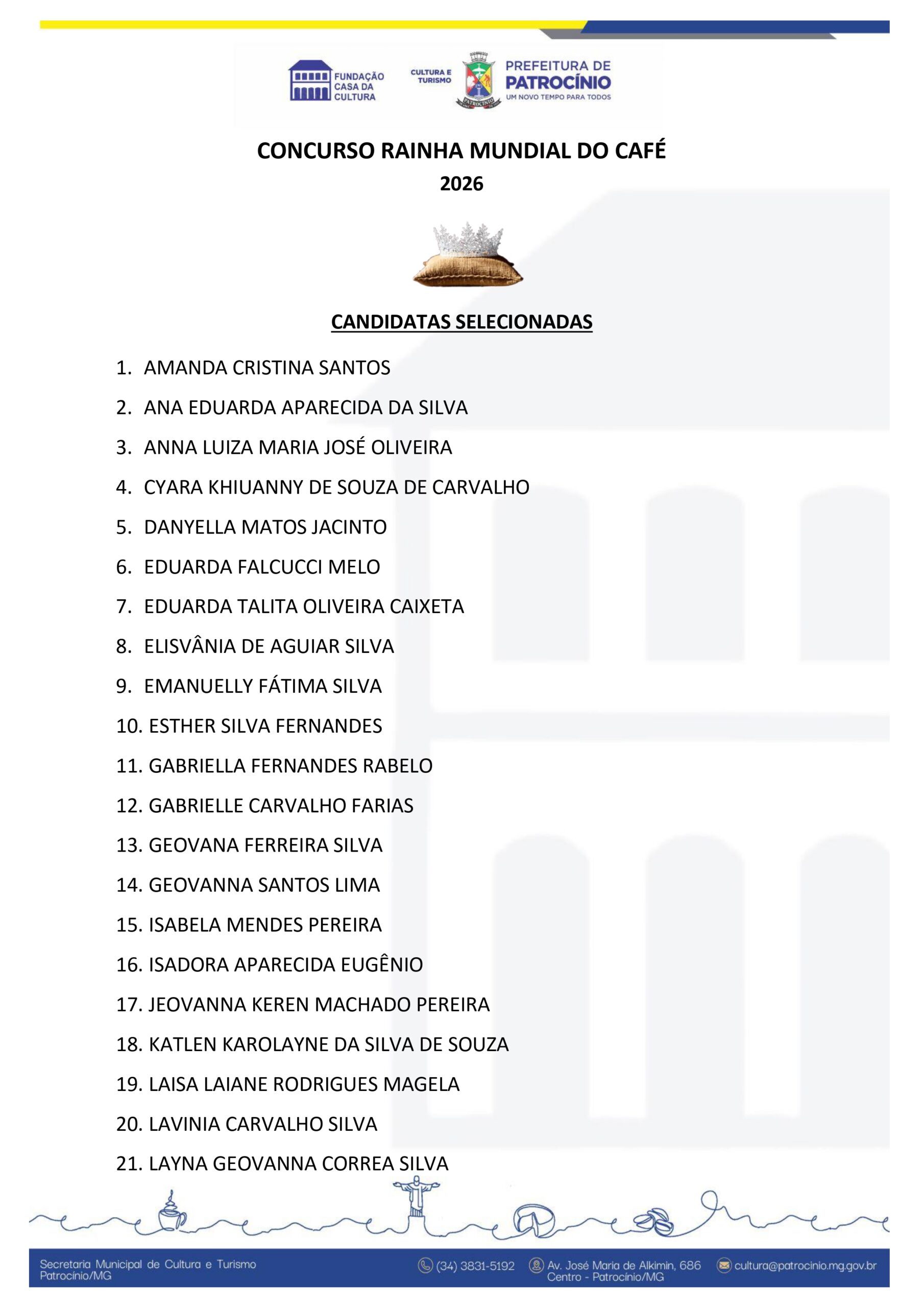 A Secretaria Municipal de Cultura e Turismo divulgou a lista das candidatas ao concurso Rainha Mundial do Café 2026. As inscrições foram encerradas no último dia 13.