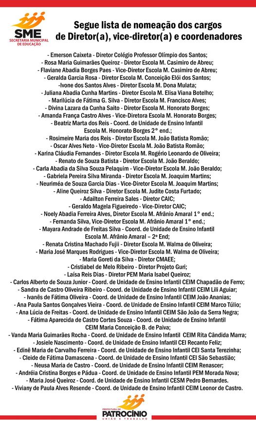 A Secretaria Municipal de Educação divulgou, nas redes sociais oficiais da Prefeitura de Patrocínio, na tarde desta quarta-feira (10), a lista de nomeação para os cargos de diretor (a), vice-diretor (a) e coordenadores para a gestão 2021/ 2024 da rede municipal de ensino.