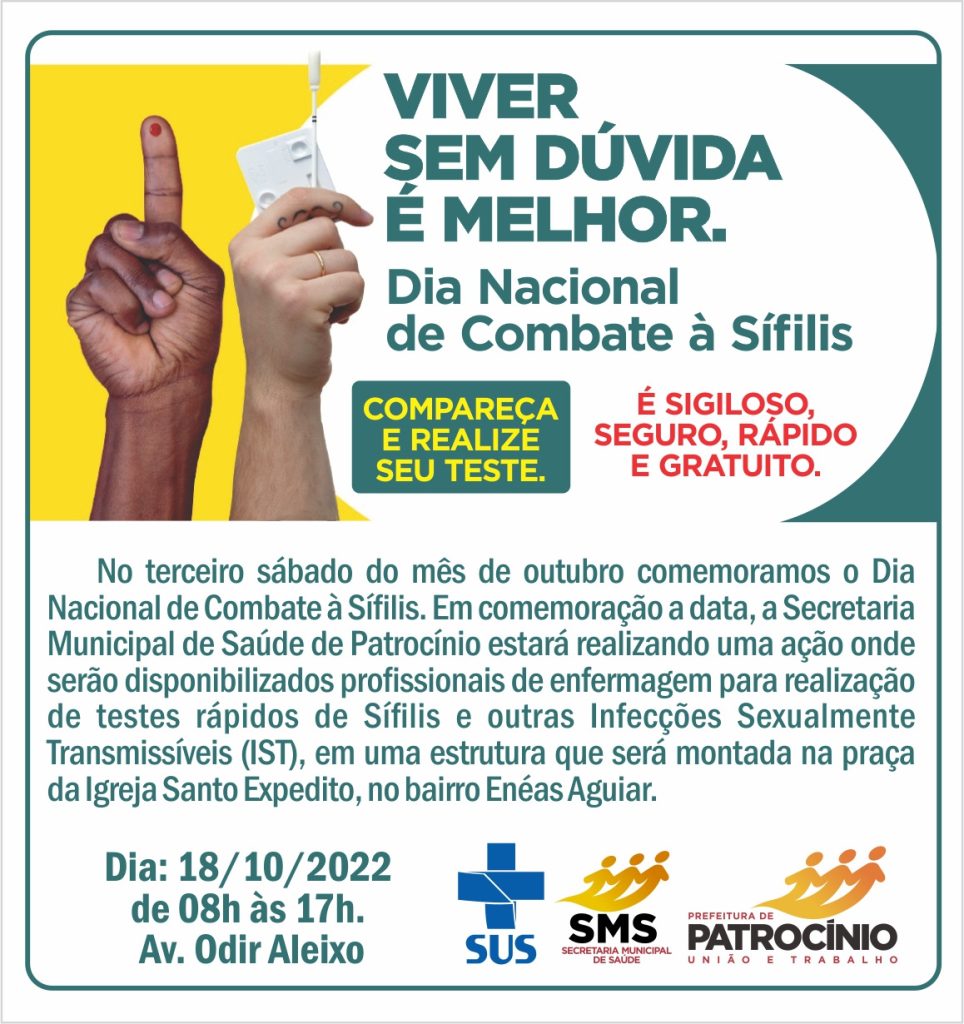 O 3º sábado do mês de outubro foi instituído como o Dia Nacional de Combate à Sífilis, neste ano será comemorado no dia 22 de outubro.
