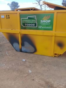 A prefeitura Municipal de Patrocínio adquiriu 14 caçambas que foram espalhadas em vários pontos da zona rural, para que os moradores e pessoas que vão aos finais de semana para a represa, depositem lixo nas mesmas. Porém, foi detectado que esses dispositivos estão sendo alvos de vandalismo, quando está sendo ateado fogo e com isso causando estragos, ou mesmo o lixo é arremessado e cai do lado de fora. O Secretário Municipal de Obras, Jorge Marra pede apoio da população e apresentou várias fotos dos prejuízos que a população através da prefeitura está tendo com essa ação. Ele pede para que as pessoas parem os carros e depositem de forma correta o lixo e que não coloquem fogo nessas caçambas e com isso ajudando a manutenção do patrimônio público.