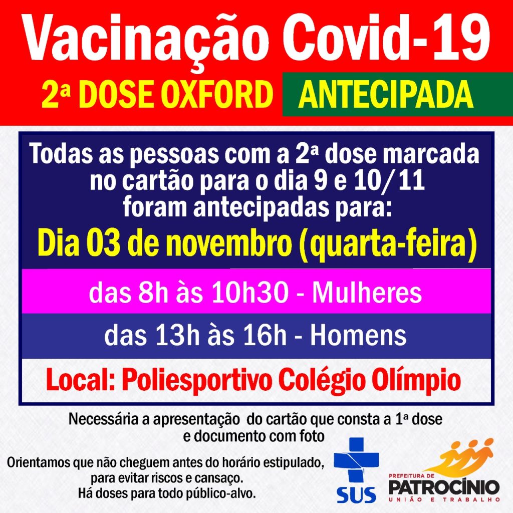 Na próxima quarta-feira (03) será antecipada a 2ª dose da vacina Oxford para aqueles que possuem data marcada no cartão para o dia 09 e 10 de novembro.