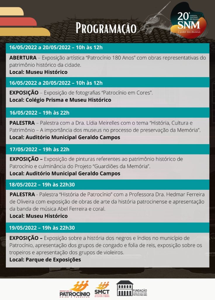 Segue abaixo a programação Semana Nacional dos Museus em Patrocínio: