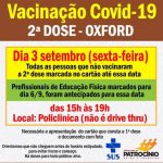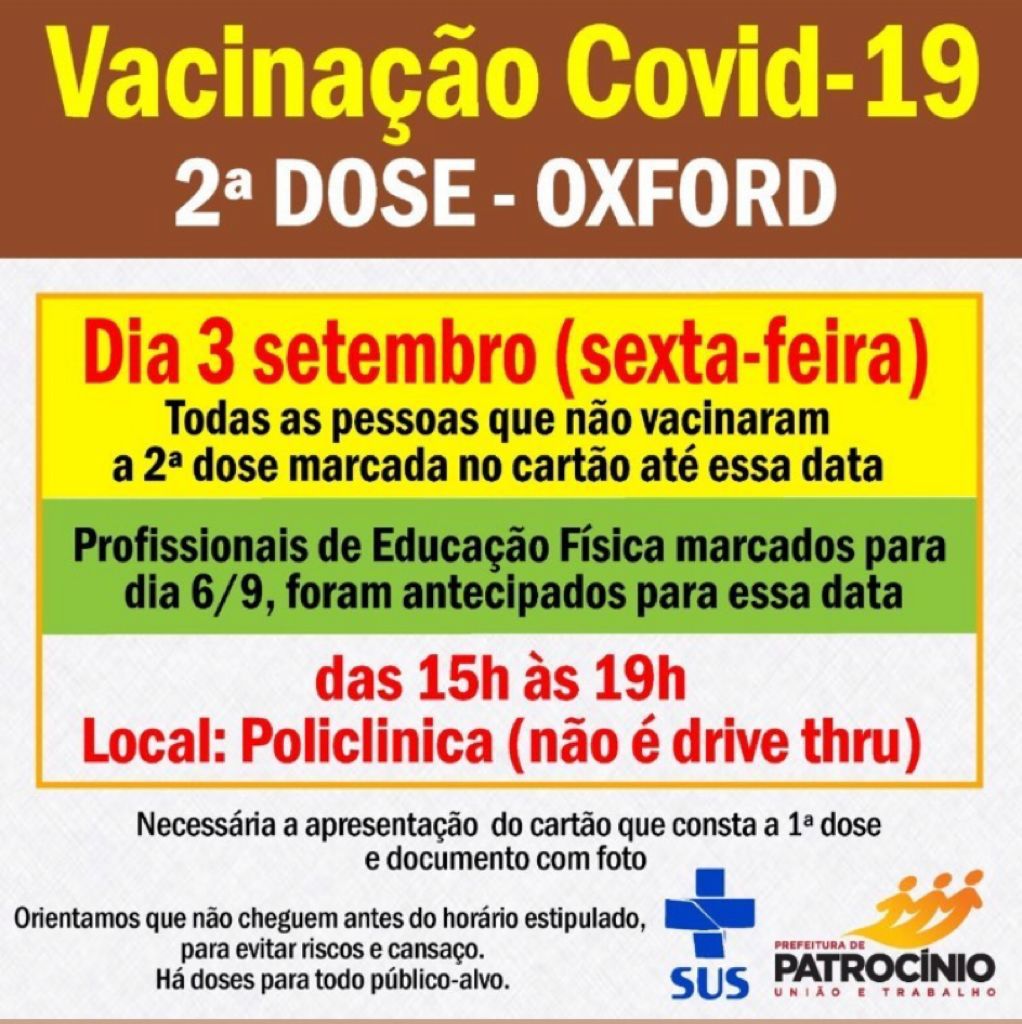 Poderão receber a dose todas as pessoas que têm a 2ª dose agendada até esta data. Os profissionais de Educação Física marcados para o dia 06/09 também poderão ser vacinados adiantados.