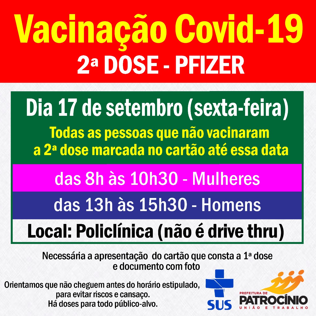 Nesta sexta-feira, 17, acontece, em Patrocínio, a vacinação da 2ª dose do imunizante da Pfizer. Podem receber a imunização todas as pessoas que ainda não vacinaram a 2ª dose marcada no cartão até esta data.