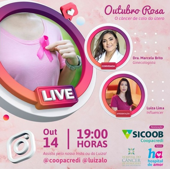 Dentro da sequência de lives programadas para o Outubro Rosa, Sicoob Coopacredi e Hospital do Câncer de Patrocínio realizam nesta quarta-feira (14) a live com a médica ginecologista Marcela Brito.