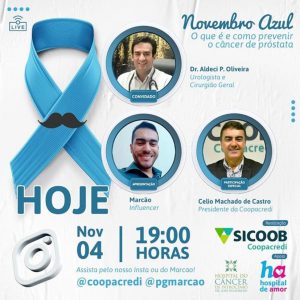 Assim como ocorreu em outubro com a campanha Outubro Rosa, no mês de novembro, o Sicoob Coopacredi, em parceria com o Hospital do Câncer, realizará uma série de lives sobre o câncer de próstata, em prol do Novembro Azul.