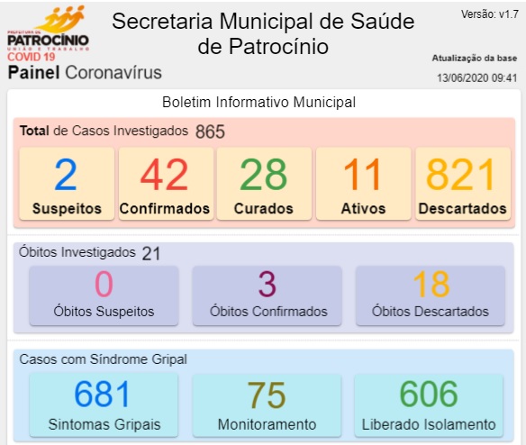 Novo boletim epidemiológico sobre os casos de coronavírus em Patrocínio foi divulgado pela Secretaria Municipal de Saúde na manhã deste sábado (13).