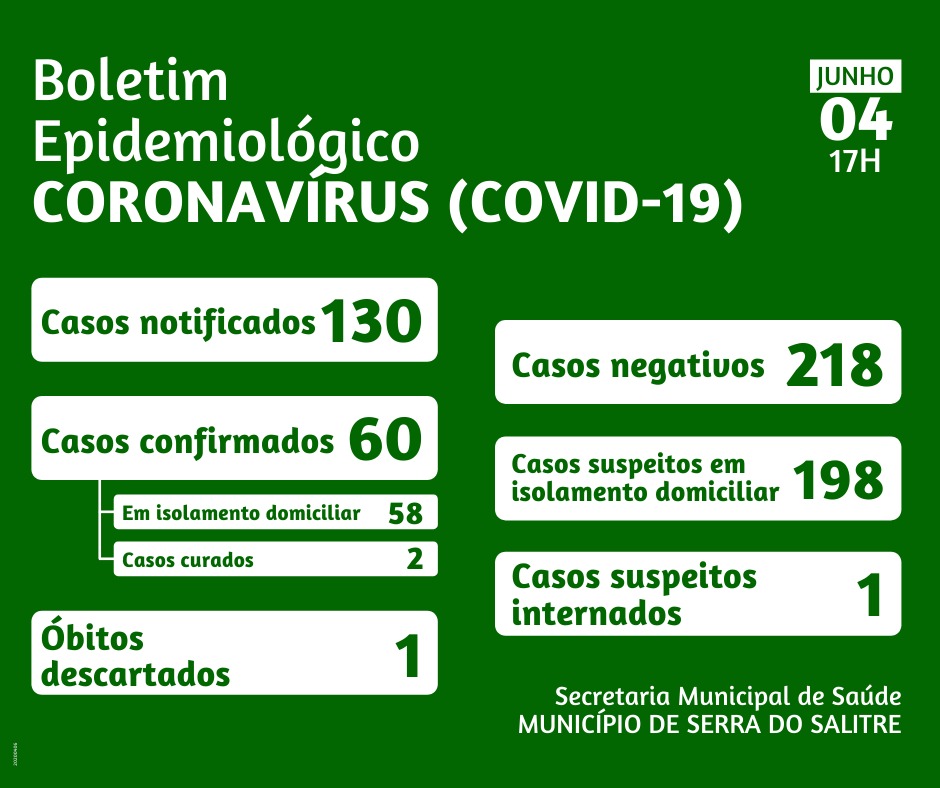 A equipe de saúde de Serra do Salitre, juntamente ao prefeito do município, Paulo Giovani (Joca), veio a público na noite desta quinta-feira (04) informar que foi realizado o fechamento dos dados de casos positivos de coronavírus na cidade.