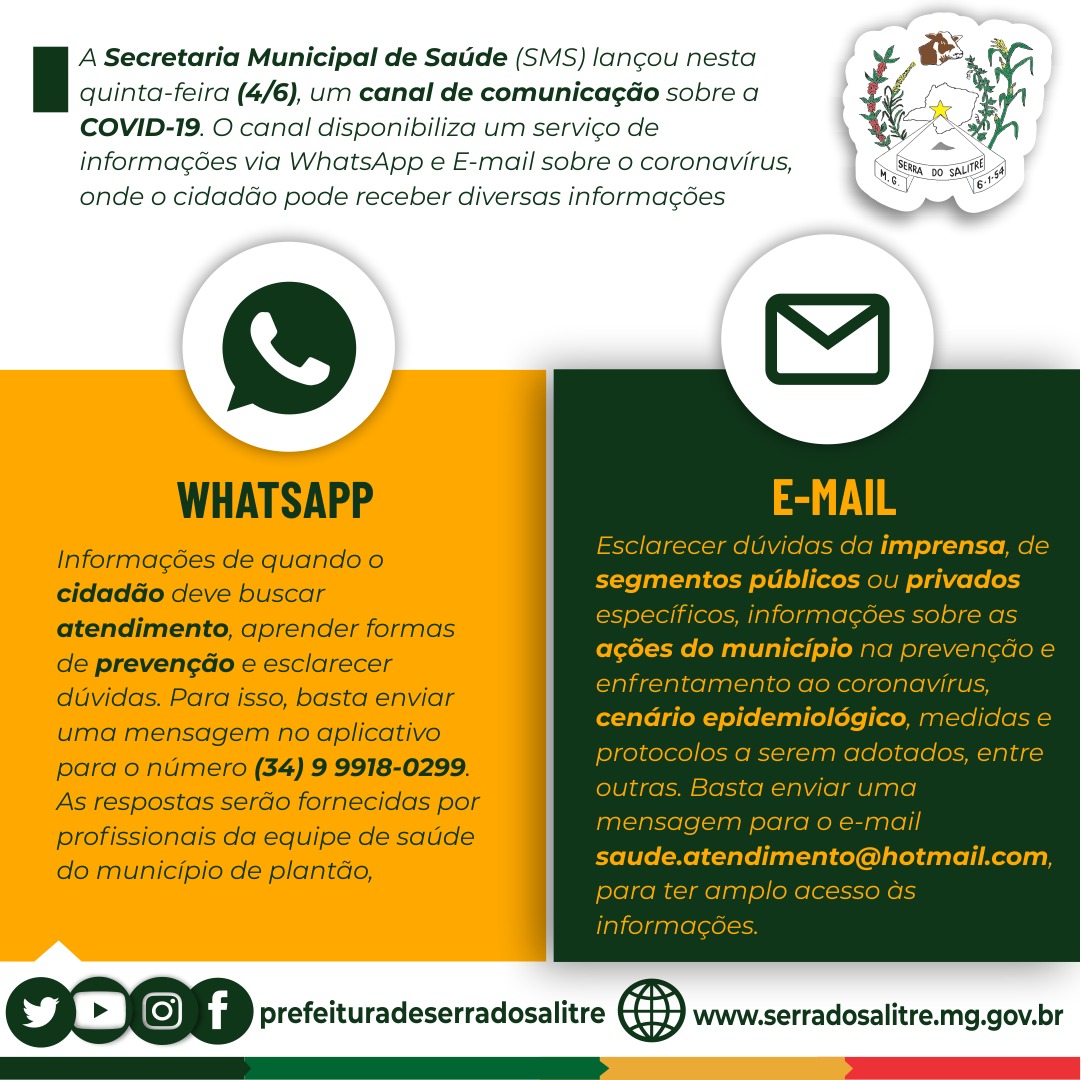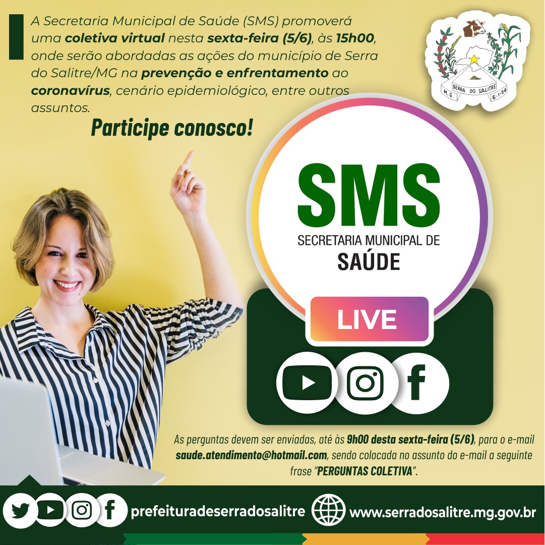 A Secretaria Municipal de Saúde (SMS) promoverá uma coletiva virtual nesta sexta-feira (05), às 15h00, que abordará as ações do município de Serra do Salitre na prevenção e enfrentamento ao coronavírus, cenário epidemiológico, entre outros assuntos.