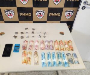 Na busca veicular, os militares localizaram 14 tabletes de substância semelhante à maconha, além de uma máquina de cartão, um celular e R$ 724,00 em dinheiro.