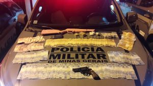 Ao ser realizada busca no imóvel, foi encontrada a quantia de mais de 37 mil reais em dinheiro trocado, porções de maconha, balança de precisão, caderno com a contabilidade do tráfico, uma espingarda de chumbinho e nove munições intactas. Os materiais foram apreendidos, mas o suspeito não foi localizado.