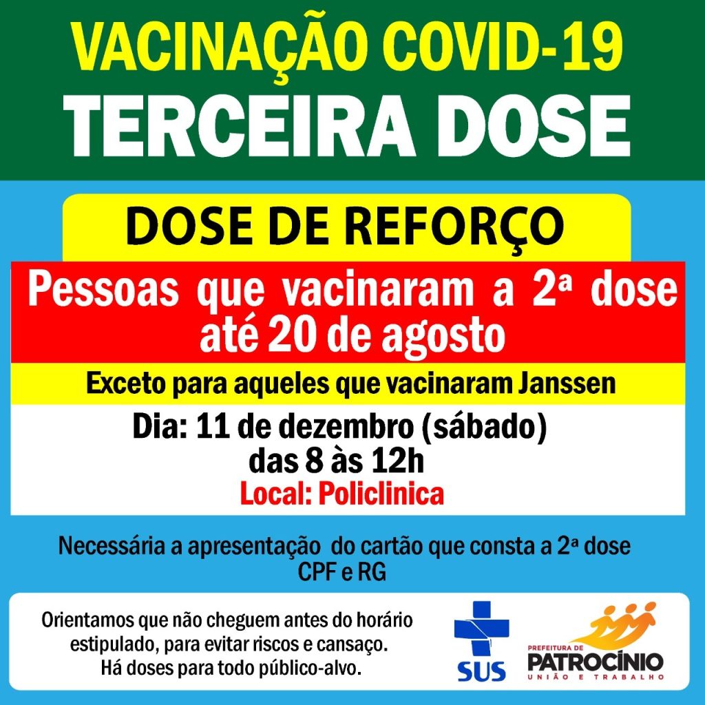 Neste sábado (11) será aplicada a terceira dose de reforço contra Covid-19, para pessoas que vacinaram 2° dose até 20 de agosto, exceto para aqueles que tomaram a Janssen.