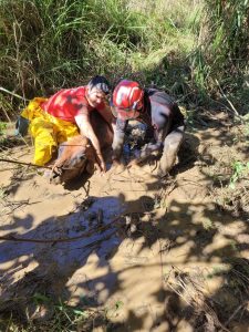 Utilizando de técnicas de salvamento, militares conseguiram desvencilhar os membros dianteiros do animal e fazer o arraste até a margem do brejo, deixando o animal em local seguro.