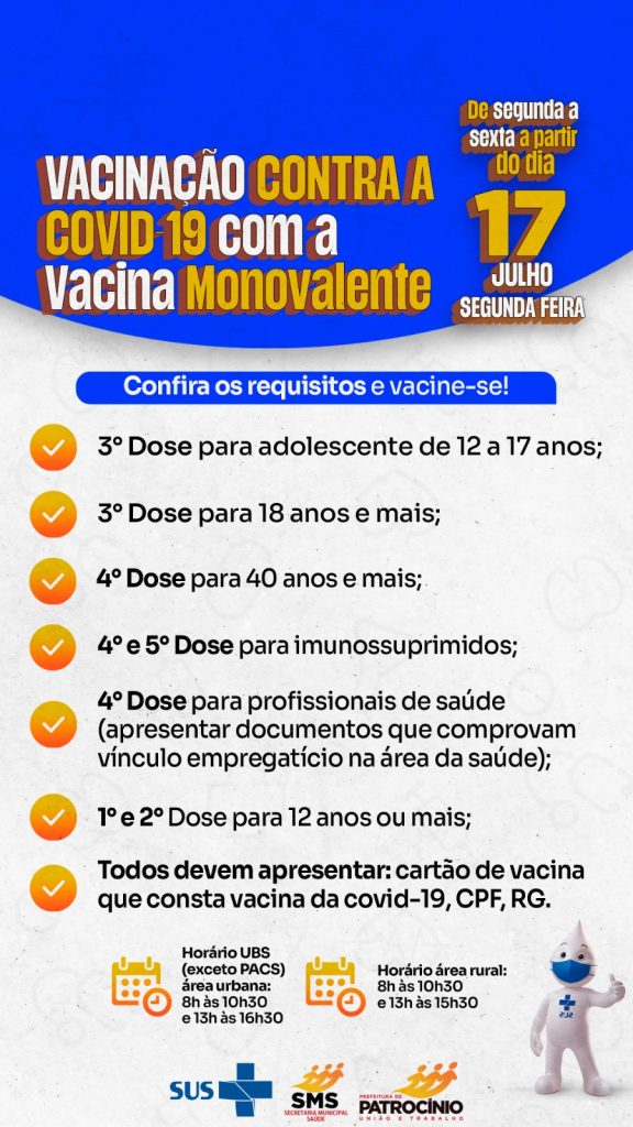 O horário da vacinação nas UBS área urbana é de 08h00 as 10h30 e 13h00 às 18h30. A área rural terá o horário de 08h00 às 10h30 e 13h00 às 15h30. Já nas Pacs o horário é de 13h as 15h30.