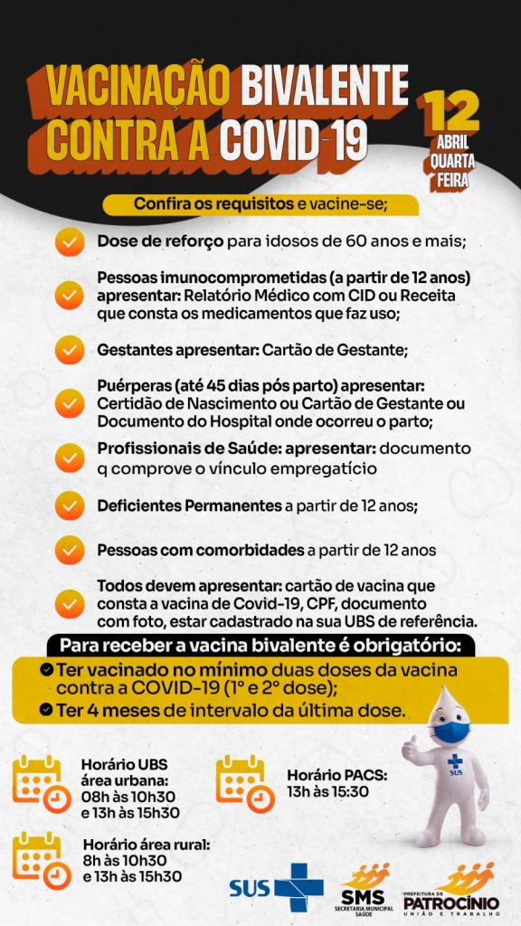 Nesta quarta-feira (12) será aplicada a vacinação bivalente contra a Covid-19, porém, é necessário cumprir os requisitos prescritos pela Secretaria Municipal de Saúde.