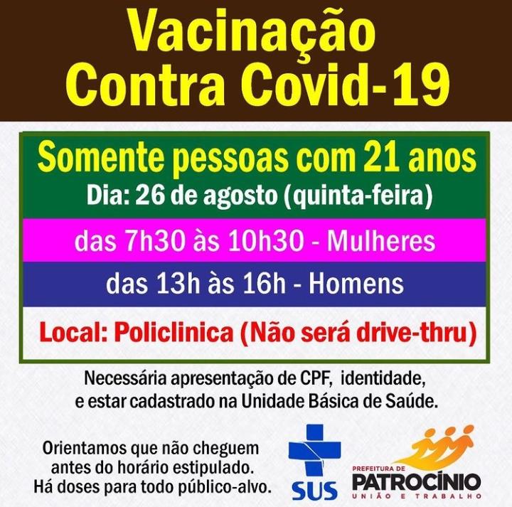 Vacinação contra a COVID-19: jovens de 21 anos serão imunizados nesta quinta-feira, 26, em Patrocínio