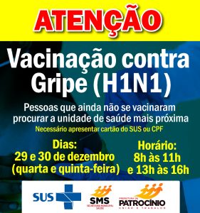 A Secretaria Municipal de Saúde de Patrocínio divulgou nesta terça-feira (28) novas oportunidades de vacinação contra a gripe (H1N1).