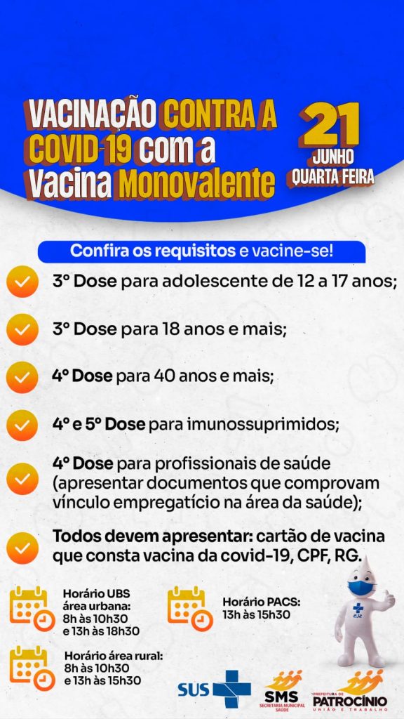 O horário da vacinação nas UBS área urbana é de 08h00 as 10h30 e 13h00 às 18h30. A área rural terá o horário de 08h00 às 10h30 e 13h00 às 15h30. Já nas Pacs o horário é de 13h as 15h30.