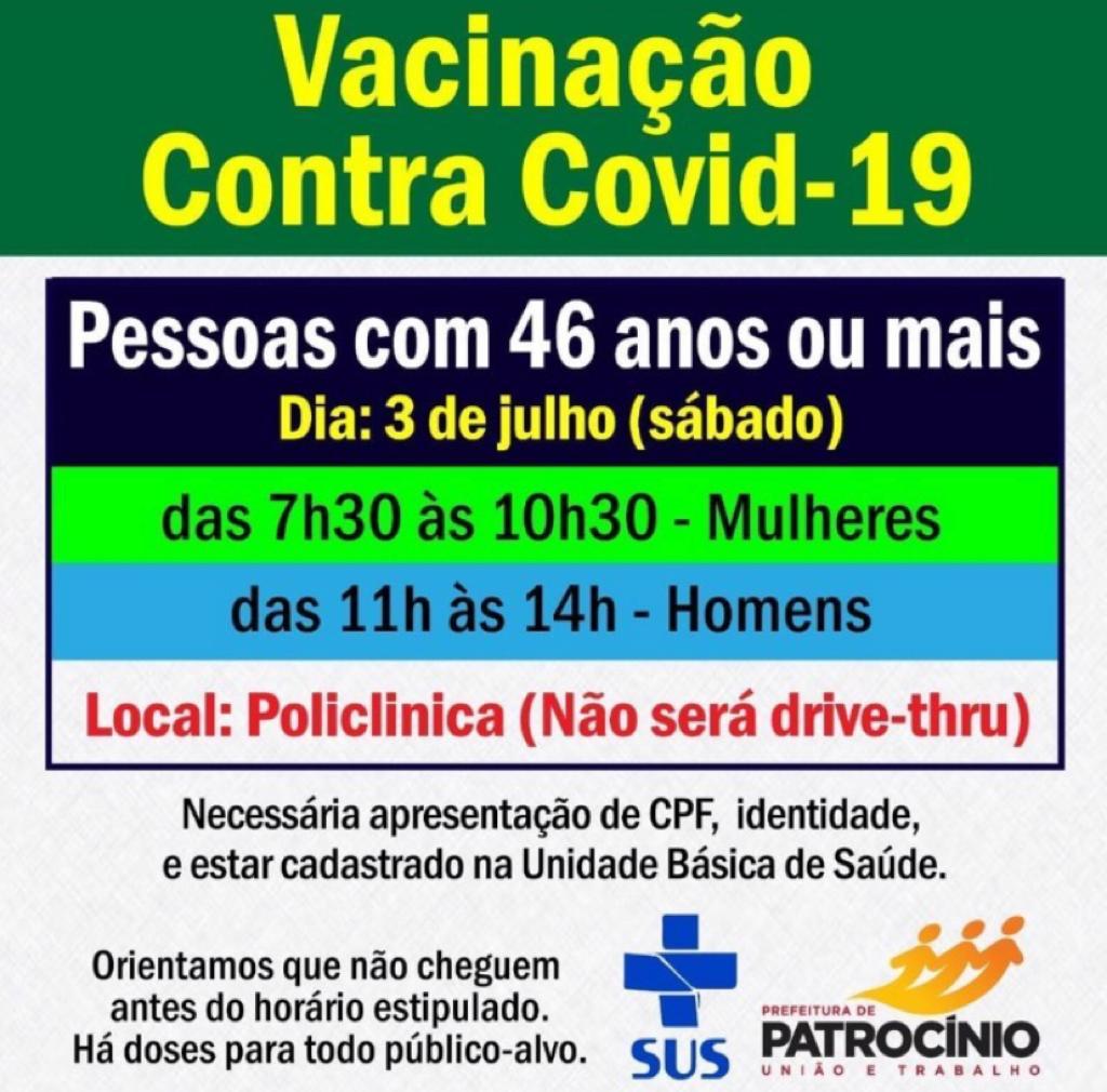 Neste sábado, 03, em Patrocínio, acontece a vacinação das pessoas de 46 anos de idade e das pessoas com mais de 46 anos que ainda não conseguiram de vacinar.