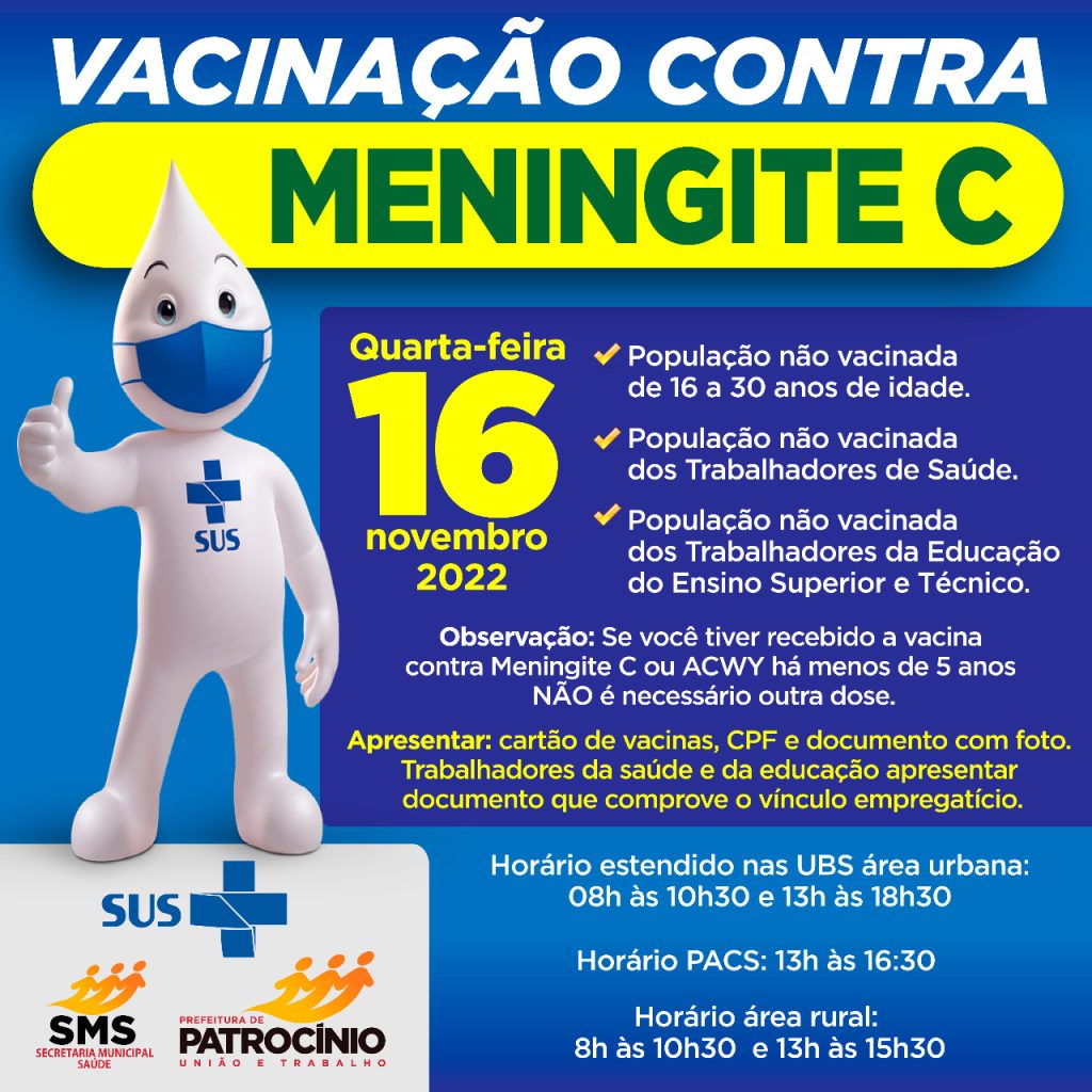 A Secretaria Municipal de Saúde realiza nesta quarta-feira (16), a vacinação contra Meningite C para a população não vacinada de 16 a 30 anos, dos trabalhadores de saúde e trabalhadores da educação do ensino superior e técnico.