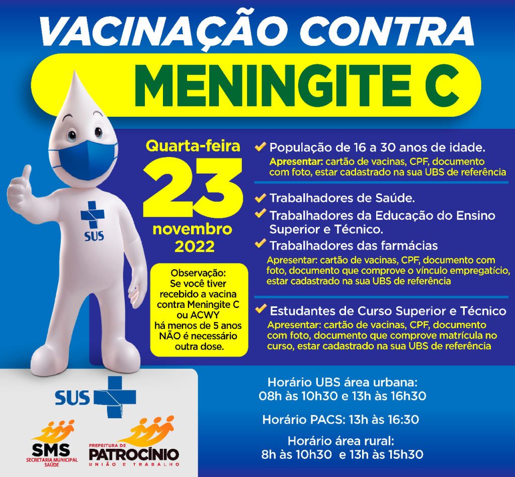 A Secretaria Municipal de Saúde realiza nesta quarta-feira (23), a vacinação contra Meningite C para a população não vacinada de 16 a 30 anos, dos trabalhadores de saúde e trabalhadores da educação do ensino superior e técnico e trabalhadores de farmácia.