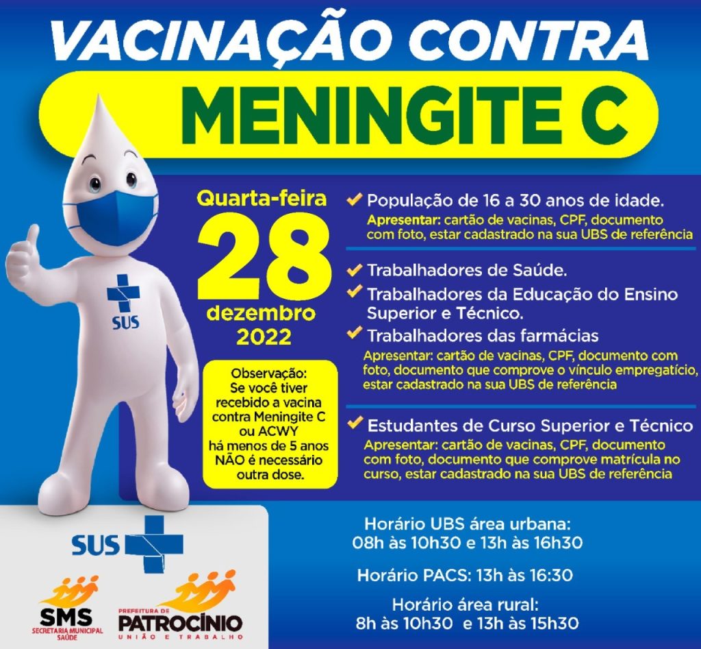 A Secretaria Municipal de Saúde realiza nesta quarta-feira (28), a vacinação contra Meningite C para a população não vacinada de 16 a 30 anos, dos trabalhadores de saúde, dos trabalhadores da educação do ensino superior e técnico, trabalhadores de farmácia e estudantes de curso superior e técnico.