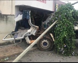 O caminhão sem freio por pouco não entrou em um estabelecimento comercial. Por sorte ninguém se feriu no acidente.