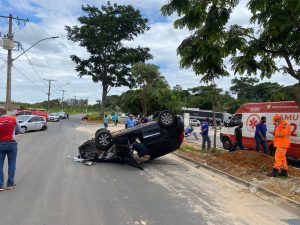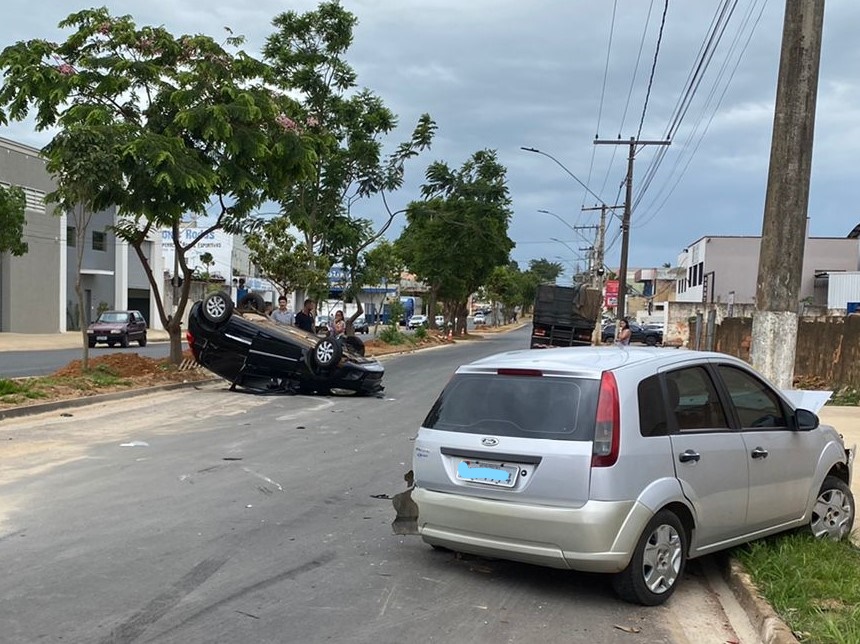 Veículo capota após colidir em carro estacionado em avenida de Patrocínio