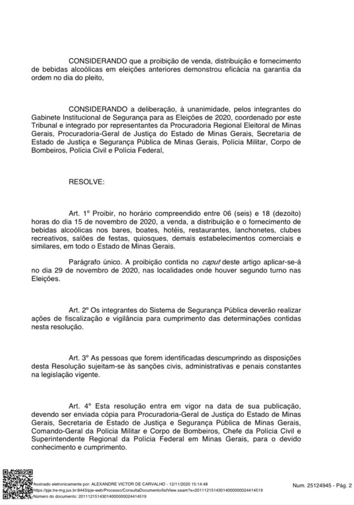 Segundo a resolução publicada no dia 12 de novembro pelo TRE de Minas Gerais, as pessoas que forem identificadas descumprindo a proibição estarão sujeitas a sanções civis, administrativas e penais.