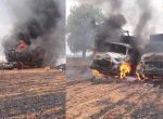 Colheitadeira e caminhões pegam fogo em Macaúbas de Baixo