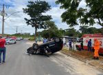 Veículo capota após colidir em carro estacionado em avenida de Patrocínio